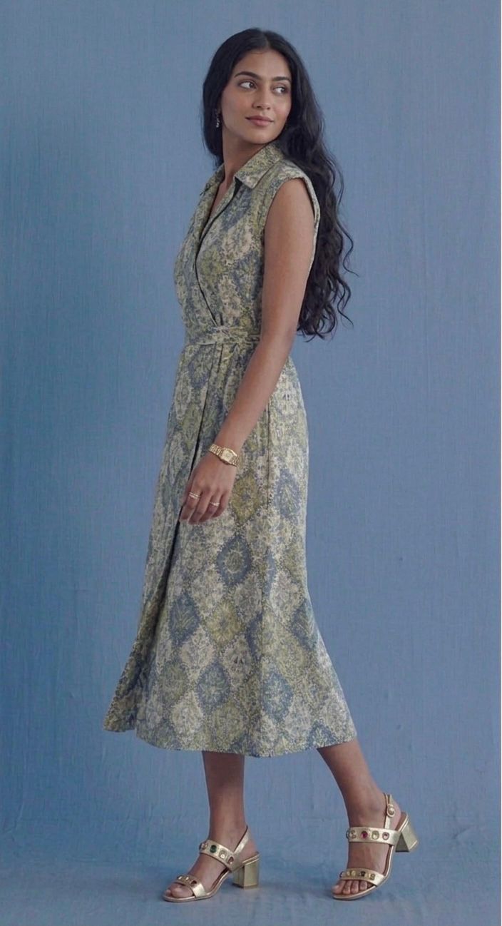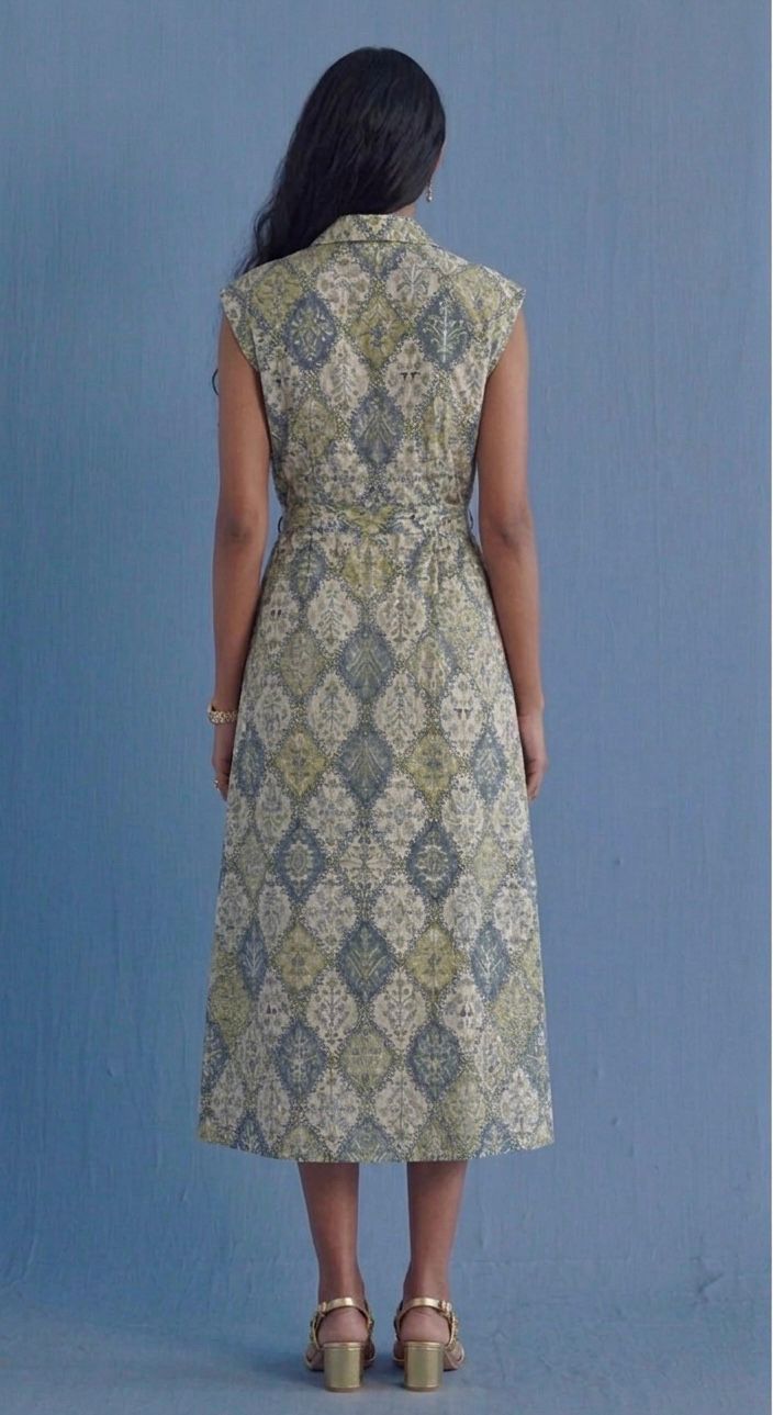 Effortlessly refined and consciously crafted, the Mena Tawl Collar Dress is made from breathable organic cotton for all-day comfort. Featuring a soft geometric print in calming hues, this midi dress brings together timeless design and modern ease. The tailored tawl collar and sleeveless silhouette add a structured elegance, while the gently flared hem creates a flattering, feminine flow.