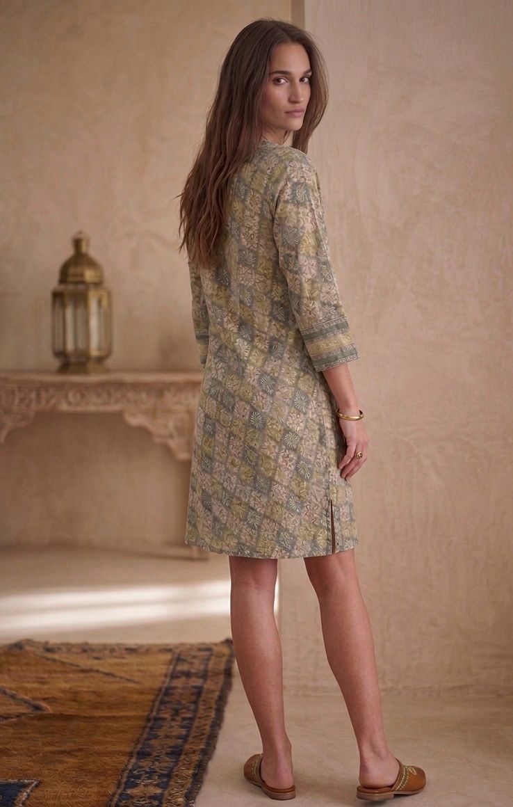 An earthy-toned short kurta dress featuring a subtle geometric floral print in muted greens and beiges. Designed in a breathable fabric with a straight, relaxed fit, it includes three-quarter sleeves and a notched neckline for a clean, modern look. Effortlessly stylish and comfortable, it’s perfect for everyday wear and minimal chic styling.